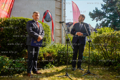 Wrzeszcz, ul. Fiszera 7. Odsłonięcie tablicy poświęconej prof. Edmundowi Cieślakowi i dr Katarzynie Cieślak - historykom upowszechniającym wiedzę o Gdańsku oraz Pomorzu. Nz. Waldemar Ossowski dyrektor Muzeum Gdańska i Piotr Borawski, zastepca Prezydenta Gdańska. 19.09.2024 fot. Paweł Marcinko / KFP