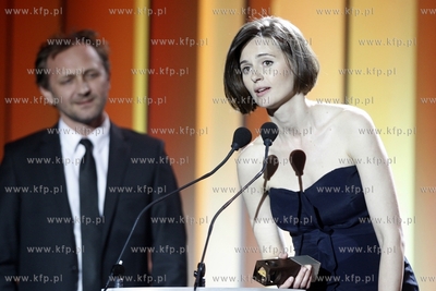 37 Gdynia Film Festival. Uroczysta gala wreczenia nagrod w Teatrze Muzycznym. Nz Andrzej Chyra wrecza nagrode Agnieszce Grochowskiej za główną rolę kobiecą w filmie W ciemności. 12.05.2012 fot. Krzysztof Mystkowski / KFP