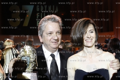37 Gdynia Film Festival. Uroczysta gala wreczenia nagrod w Teatrze Muzycznym. Nz producent Juliusz Machulski i aktorka Agnieszka Grochowska ze Zlotymi Lwami za film Agnieszki Holland W Ciemnosci. 12.05.2012 fot. Krzysztof Mystkowski / KFP