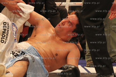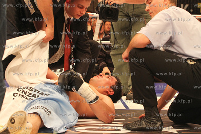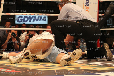 Gala Wojak Boxing Night w Gdyni. W walce o pasy federacji WBC Baltic i WBA International Andrzej Wawrzyk ciezko znokaltowal Nelsona Dario Domingueza z Argentyny. Nz.Ciezki nokalt zaliczony przez Nelsona Dario Domingueza.