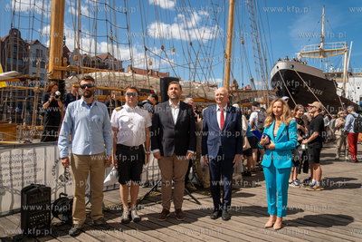 Żaglowiec Generał Zaruski wypłyną, w 101-dniową wyprawę na Spitsbergen. Rejs ten upamiętnia 50. rocznicę historycznej podróży z 1975 roku, kiedy to pod dowództwem kapitana Andrzeja Rościszewskiego pierwszy polski jacht dotarł do stacji polarnej w Hornsundzie. Nz. Piotr Królak, dyrektor Gdańskiej Szkoły pod Żaglami, Marcin Dobrowolski, kapitan Generała Zaruskiego, Piotr Borawski, wiceprezydent Gdańska, Krzysztof Czopek, dyrektor Działu Infrastruktury Urzędu Marszałkowskiego. 30.06.2025 fot. Paweł Marcinko / KFP