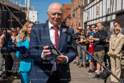 Żaglowiec Generał Zaruski wypłyną, w 101-dniową wyprawę na Spitsbergen. Rejs ten upamiętnia 50. rocznicę historycznej podróży z 1975 roku, kiedy to pod dowództwem kapitana Andrzeja Rościszewskiego pierwszy polski jacht dotarł do stacji polarnej w Hornsundzie. Krzysztof Czopek, dyrektor Działu Infrastruktury Urzędu Marszałkowskiego prezentuje pamiątkowy medal dla uczestników rejsu. 30.06.2025 fot. Paweł Marcinko / KFP