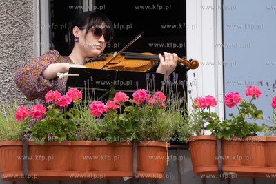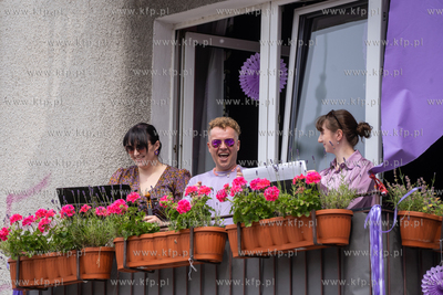 Gdańsk. Świeto ulicy Lawendowej to lokalna inicjatywa mieszkańców i podmiotów działających na ulicy oraz nieformalnej grupy Lawendowa OdNowa. Nz. "Lawendowe Koncerty Balkonowe" - Arie Barokowe w wykonaniu Mirosława Małeckiego - sopranisty lokalizacja: Balkon Salonu Fryzjerskiego Miro's Love 25.05.2024 fot. Paweł Marcinko / KFP
