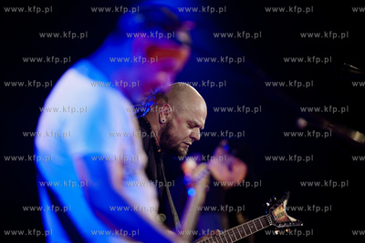 Gdansk. Ergo Arena. Koncert jednego z najwazniejszych zespolow w historii polskiego rocka - Illusion. Byl to jeden z trzech koncertow, podczas ktorych powstaje material na plyte DVD. Nz basista zespolu Jaroslaw Smigiel, tuz za nim lider i wokalista Tomasz "Lipa" Lipnicki. 05.11.2011 fot. Mateusz Ochocki / KFP