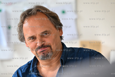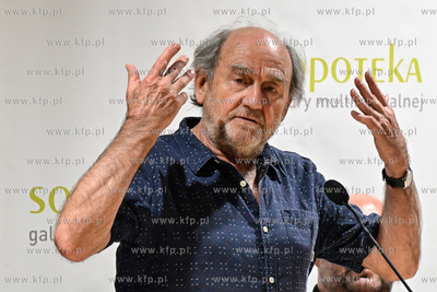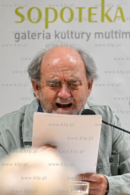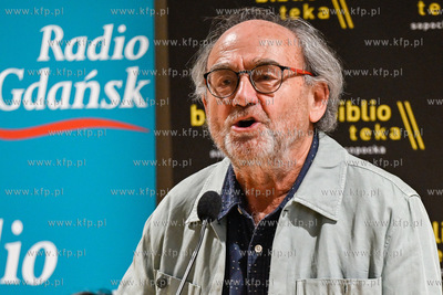Miejska Biblioteka Publiczna w Sopocie. Filia Sopoteka. Spotkanie z cyklu Poczytaj Mi. Gosciem spotkania był Jan Peszek, który wspólnie z bibliotekarzami biblioteki sopockiej oraz wyłonionym podczas castingu czytelnikiem odczytał fragmenty Don Kichota z La Manchy Miguela de Cervantesa. Prowadzenie PIotr Łukawski. Nz. PIotr Łukawski. 09.08.2024 / fot. Jerzy Bartkowski / KFP