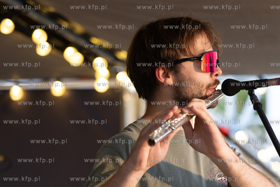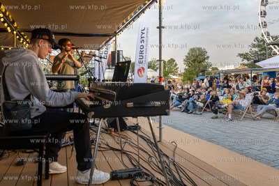 Gdańsk, Ołowianka. Jazz na Wyspie Nz. Koncert zespołu Omasta w składzie: Paweł Kowalik - trąbka, Antoni Blumhoff - flet, saksofon sopranowy, Bruno Sikorski - fortepian, Wojciech Roman - gitara basowa, Nikodem Wikieł - perkusja. 30.07.2025 / fot. Anna Rezulak / KFP