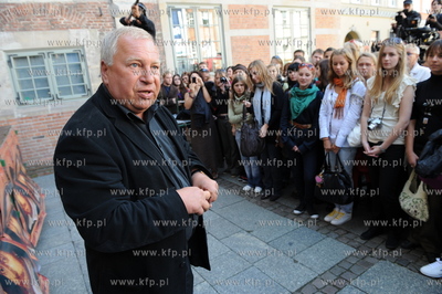 Gdansk. Dlugi Targ. Happening pt Aktorzy Przyjechali z okazji wmurowania kamienia wegielnego pod budowe Teatru Szekspirowskiego w Gdansku. Na starowce najznamienitsi polscy aktorzy odgrywali sztuki Szekspira w rezyserii Andrzeja Wajdy. Nz. Jerzy Stuhr 14.09.2009 fot. Mateusz Walasinski / KFP