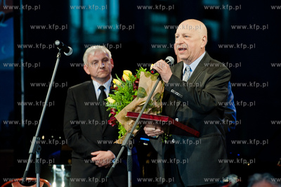 Sopot. Scena na Placu Zdrojowym. Uroczyste Otwarcie XII Festiwalu Teatru Polskiego Radia i Teatru Telewizji Dwa Teatry - Sopot 2012. Kulminacyjnym punktem uroczystości otwarcia było wręczenie Wielkiej Nagrody Festiwalu "Dwa Teatry" za wybitne kreacje aktorskie w Teatrze Polskiego radia i Teatrze Telewizji Polskiej dwójce aktorów: Annie Seniuk i Jerzyemu Stuhrowi. 19.05.2012 fot. Mateusz Ochocki / KFP