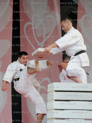 III Ogolnopolski Zlot Fanow M jak Milosc. Pokaz karate Fudokan z udzialem Roberta Moskwy - aktora (serialowego doktora Artura Rogowskiego), a rowniez karateki (brazowego medalisty Mistrzostw Europy w Karate Fudokan). Nz. Maciej Grubski - wielokrotny mistrz Swiata, Europy i Polski w karate, trener kadry karate Fudokan lamie jednym ciosem dziesiec 6-centymetrowych bloczkow z gazobetonu