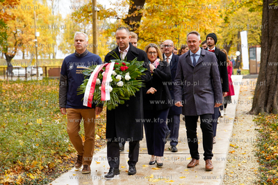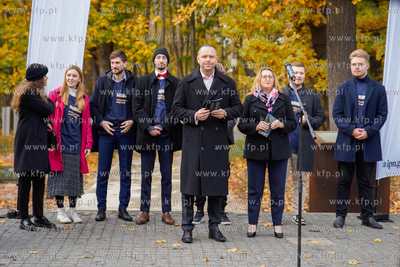 Westerplatte. Konferencja prasowa na temat projektu IPN "Straty osobowe i ofiary represji pod okupacją niemiecką w latach 1939-1945". Nz. dr Karol Nawrocki, prezes IPN i Marzena Kruk, dyrektor Archiwum IPN oraz wolontariusze biorący udział w projekcie. 31.10.2024 fot. Paweł Marcinko / KFP