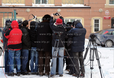 Sopot. Prokuratura Apelacyjna w Gdansku z siedziba w Sopocie. Pierwszy dzien konfrontacji Danuty Olewnik - Cieplinskiej z jednym z policjantow, ktorzy odpowiadali za przekazanie okupu porywaczom jej brata Krzysztofa Olewnika. Nz. dziennikarze zadaja pytania mezowi Danuty Olewnik, Klaudiusz Cieplinski, ktory prosil o nieujawnianie jego twarzy. 21.02.2011 fot. Jerzy Bartkowski / KFP
