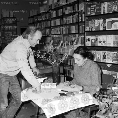 Lucyna Legut podpisauje czytelnikowi na dziure w niebie w ksiagarni Domu Ksiazki nr 19 przy ulicy Garncarskiej w Gdansku.