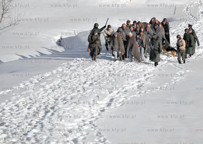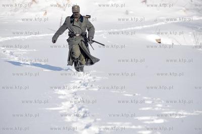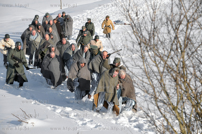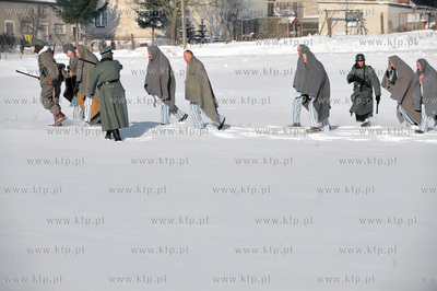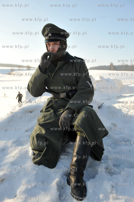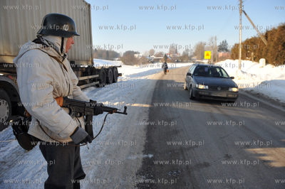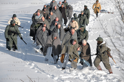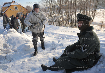 Widok uzbrojonych niemieckich zolnierzy z czasow II wojny swiatowej dziwil kierowcow przejezdzajacych przez Niestepowo na Kaszubach samochodow. Realizowano tam zdjecia do filmu dokumentalnego KL Sttuthof Fabryka Smierci. Krecone sceny zwiazane sa z tzw marszem smierci czyli zimowa ewakuacja wiezniow z obozu koncentracyjnego na zachod pod koniec II wojny swiatowej. Trasa marszu wiodla m.in przez Niestepowo i gmine Zukowo. Rezyserem filmu jest Wieslaw Kwapisz. 23.01.2010 Fot. Maciej Kosycarz / KFP
