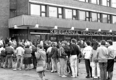 Kolejka po podreczniki szkolne do ksiegarni w Domu Technika przy ul. Rajskiej w Gdansku. 3sierpień1987_z.kosycarz_p27 17.08.1987 Fot. Zbigniew Kosycarz / KFP ZAKAZ PUBLIKACJI ZDJECIA W INTERNECIE