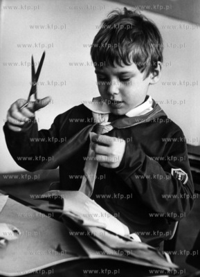 Uczen szkoly podstawowej w Gdansku podczas lekcji z uzyciem wycinanki. lata 80 1986 Fot. Zbigniew Kosycarz / KFP ZAKAZ PUBLIKACJI ZDJECIA W INTERNECIE