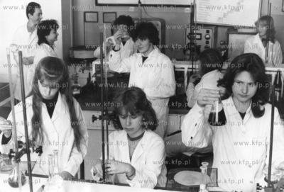 Uczniowie klasy III Technikum Chemicznego podczas zajec w laboratorium Zespolu Szkol Przemyslu Chemicznego i Spozywczego na ul. Lastadia w Gdansku. 03.1987 odb_03_234 Fot. Zbigniew Kosycarz / KFP ZAKAZ PUBLIKACJI ZDJECIA W INTERNECIE