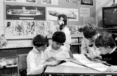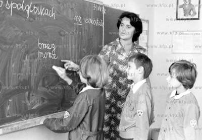 Pierwszy dzien w szkole podstawowej nr 50 im. Emilii Plater w Gdansku, przy tablicy nauczycielka Baranowska. 5sierpien77_z.kosycarz_p44 31.08.1977 Fot. Zbigniew Kosycarz / KFP ZAKAZ PUBLIKACJI ZDJECIA W INTERNECIE