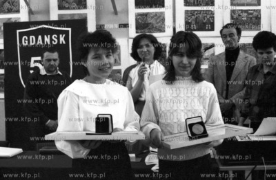 Uroczystosc w Szkole Podstawowej nr 53 im F. Dabrowskiego w Gdansku Nowym Porcie. Dzieci z tej szkoły cyklicznie braly udzial w miedzynarodowych konkursach plastycznych. Uroczystosc wreczenia zdobytych medali konkursowych. Nz. Wioletta Dorczyk i Agnieszka Nowicka, uczennice kl. VII, które zdobyly zlote medale w konkursie plasycznym Japonii 15.04.1988 2kwiecien88zkosycarz_p12 Fot. Zbigniew Kosycarz / KFP ZAKAZ PUBLIKACJI ZDJECIA W INTERNECIE
