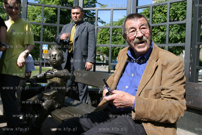Dzisiaj niemiecki pisarz Gunter Grass, goszczacy w Gdansku, odwiedzil laweczke postawiana najego czesc w dzielnicy Gdansk-Wrzeszcz, w ktorej mieszkal przed laty. Na laweczce siedzi pomnik Oskarka - bohatera Blaszanego bebenka, jednej z powiesci pisarza. 2.06.2003 fot. Wojtek Jakubowski /KFP