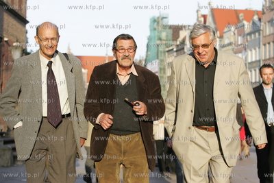 Gunter Grass w Gdansku, na zdjeciu podczas spaceru po ul. Dlugiej. Po lewej tlumacz Henryk Kleinzeller, po prawej Wieslaw Zieniewski - prezes wydawnictwa Oskar Polnord. 14.06.2005 fot. Wojtek Jakubowski /KFP