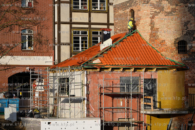 Przy mniejszej baszcie Bramy Stągiewnej powoli dobiega końca odbudowa odwachu straży spichrzowej. Rekonstrukcję budowli rozebranej pod koniec XIX wieku prowadzi firma Granaria, za sprawą której Wyspa Spichrzów przeszła w ostatnich kilkunastu latach istną metamorfozę. Kolejnym etapem inwestycji w tej części Gdańska jest rewitalizacja terenów wokół Stągwi Mlecznych. Budowa odwachu przylegającego do baszty zwanej Stągiewką lub Konwią Śmietanową osiągnęła stan surowy zamknięty. Rozpoczęły się już prace instalacyjne i wykończeniowe. Zrekonstruowany budynek stanowiący niegdyś ważny punkt obronny Gdańska będzie służyć żeglarzom. Stanowisko dowodzenia w odwachu przejmie bosman.1.02.2025 / fot. Paweł Marcinko / KFP