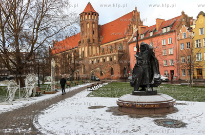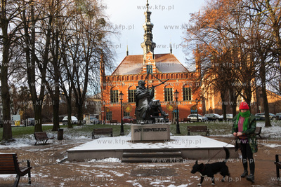 Pomnik Jana Heweliusza na skwerze w kwartale ulic Korzennej i Rajskiej w Gdańsku. Na drugim planie Ratusz Staromiejski. 3.01.2025 fot. Daniel Słoboda / KFP