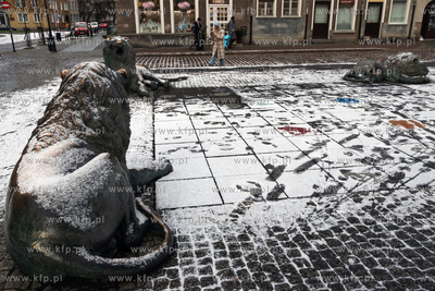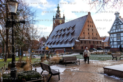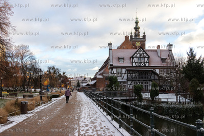 Ośnieżony Wielki Młyn na Skwerze Heweliusza w Gdańsku....