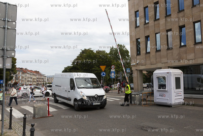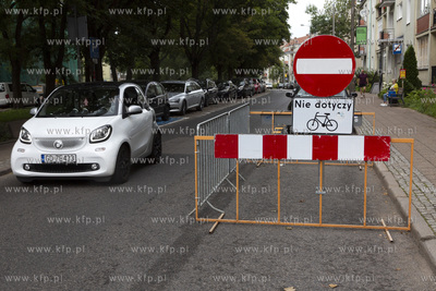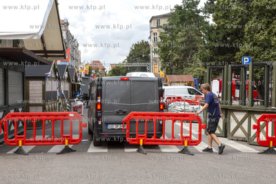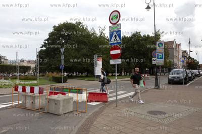 Ostatnie przygotowania do Jarmarku św. Dominika w Gdańsku. Zamknięty wjazd na ulicę Grobli I.