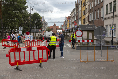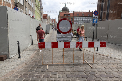 Ostatnie przygotowania do Jarmarku św. Dominika w Gdańsku. Zamknięty wjazd na ulicę Szeroką.