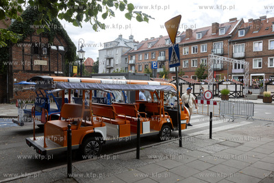 Zmiana organizacji ruchu i utrudnienia w centrum Gdańska z powodu zbliżającego się Jarmarku św. Dominika. Na zdjęciu postój melexów na zamkniętej ulicy Katarzynk.i