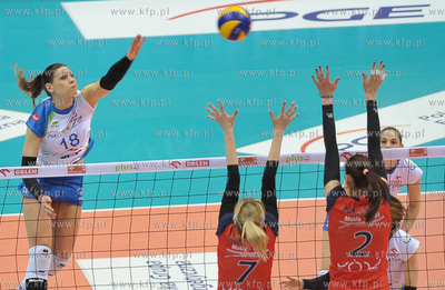 PGE ATOM TREFL: Bełcik 4, Leys 11, Tokarska 13, Zaroślińska 15, Kaczorowska 4, Cooper 12, Durajczyk (libero) oraz Miros 1, Fonoimoana, Kaczmar. 1.04.2015 / fot. Jerzy Bartkowski / KFP