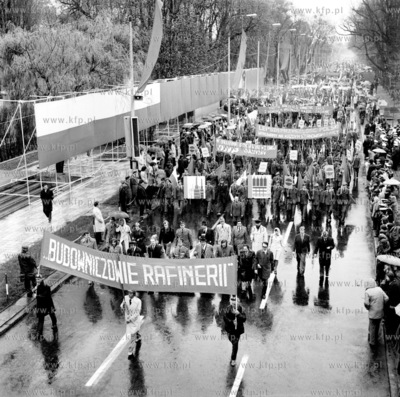 Budowniczowie Rafinerii Gdanskiej w pochodzie pierwszomajowym na al. Zwycięstwa w Gdansku Wrzeszczu . 1maj75_z.kosycarz_p5 1.05.1975 Fot. Zbigniew Kosycarz / KFP ZAKAZ PUBLIKACJI ZDJECIA W INTERNECIE