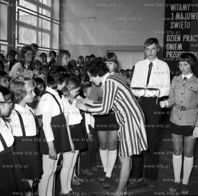 Szkola Podstawowa nr 80 przy ul. Opolskiej na Przymorzu. Uroczysta akademia 1-majowa (pierwsza w tej szkole) polaczona z wreczeniem honorowych odznak wzorowych uczniow. Z 966 uczniow 45 otrzymalo zlote, a 32 srebrne odznaki. Nz. dyrektor szkoly Malgorzata Parkasiewicz-Wrzesińska wrecza zlote odznaki najmlodszym uczniom. 27.04.1974 6kwiecien74_z.kosycarz_p58 Fot. Zbigniew Kosycarz / KFP ZAKAZ PUBLIKACJI ZDJECIA W INTERNECIE