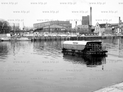 Prom linowy w Gdansku na Motlawie. Ponad rok pozniej widoczny na zdjeciu prom zatonal pociagajac za soba kilkanacie smiertelnych ofiar. Po lewej znajdowaly sie zaklady Elmor. 27.04.1974 6kwiecien74_z.kosycarz_p58 Fot. Zbigniew Kosycarz / KFP ZAKAZ PUBLIKACJI ZDJECIA W INTERNECIE
