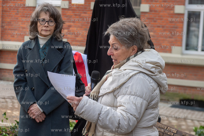 Gdańsk, Biskupia Górka. Uroczystość odsłonięcia pomnika gdańskiego bówki Brunona Zwary przy ul. Biskupiej 33. Nz. Joanna Szymańska ze Stowarzyszenia Ławeczka Brunona Zwarry. Maria Dryżał, córka Brunona Zwarry 21.12.2024 fot. Paweł Marcinko / KFP