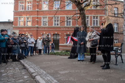 Gdańsk, Biskupia Górka. Uroczystość odsłonięcia pomnika gdańskiego bówki Brunona Zwary przy ul. Biskupiej 33. Nz. Maria Dryżał, córka Brunona Zwarry 21.12.2024 fot. Paweł Marcinko / KFP