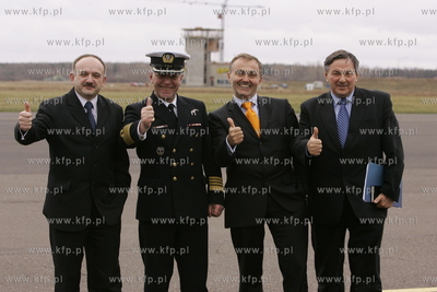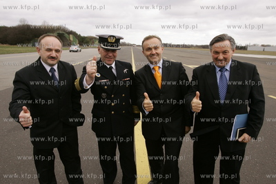 W Gdyni Kosakowie na terenie lotniska wojskowego Babie Doly powstanielotnisko cywilne. W zwiazku z tym zwolano w tym miejscu konferencje prasowa . Nz od lewej : Janusz Stateczny - prezes Zarzadu Portu Lotniczego Gdynia-Kosakowo Sp z o.o., kmdr pil. Stanislaw Ciolek - Dowodca Brygady Lotnictwa Marynarki Wojennej, prezydent Gdyni Wojciech Szczurek i Jerzy Wludzik - wojt gminy Kosakowo. 28.02.2008 fot. Wojtek Jakubowski /KFP