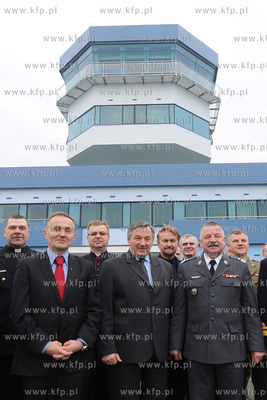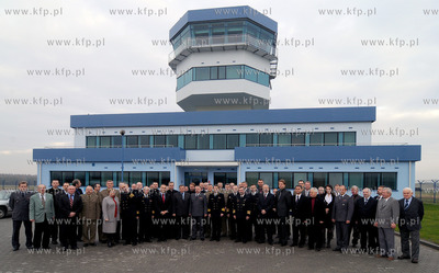 Gdynia. Baza Lotnicza Marynarki Wojennej w Babich Dolach. Przekazanie nowowybudowanej wiezy kontroli lotow, w ktorej za niespelna miesac sluzby ruchu lotniczego Mw rozpoczna prace. Bedzie to jeden z najnowoczesniejszych tego typu obiektow w Polsce. Inwestycje wykonala firma Elketrobudowa Katowice. Nz Pamiatkowe zdjecie uczestnikow uroczystosci 10.12.2009 Fot. Andrzej J. Gojke / KFP