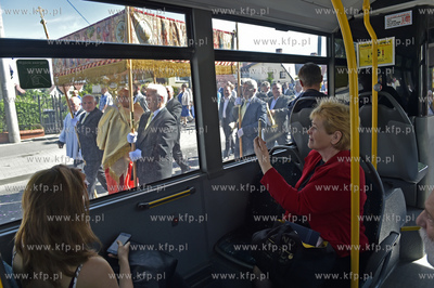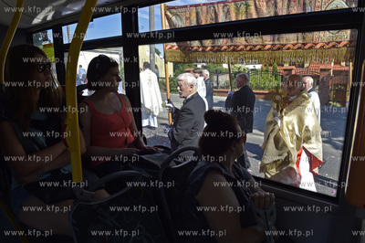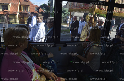Procesja Bożego Ciała parafii p.w. Maksymiliana Kolbe w gdańskiej dzielnicy Suchanino. Procesja widziana przez okna miejskiego autobusu.Pasażerów błogosławi niosący montrancję, proboszcz, ksiądz Piotr Toczek. 15.06.2017 Fot. Maciej Kosycarz / KFP