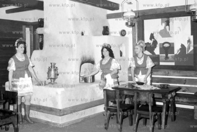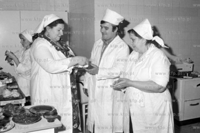 Kuchnistrz restauracji Europejska w Leningradzie Olga Iwanowna Tichonowa w towarzystwie Waldemara Gerono i Jana Brzezinskiego przy kuchni restauracji Newska podczas przyrzadzania posilkow.