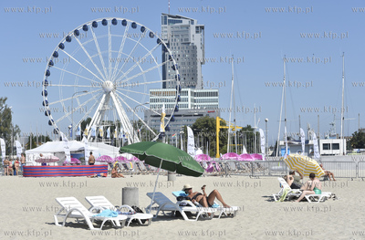 Plaża Gdynia - Środmieście. Nz. Koło widokowe w Gdynia Family Park, a w oddali wieżowiec Sea Towers. 26.07.2018 fot. Maciej Kosycarz / KFP