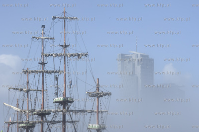 Gdynia. Maszty wycieczkowego galeonu, w woddali we mgle Sea Towers. 28.03.2019 fot. Maciej Kosycarz / KFP
