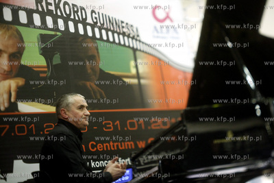 Gdansk. Centrum handlowe Alfa Centrum. Niezwykla probe ustanowienia nowego swiatowego rekordu w najdluzszej grze na fortepianie podejmuje znany podroznik Romuald Koperski. Obecny rekord w tej kategorii wpisany do Ksiegi Guinnessa nalezy do Wegra Charlesa Brunnera i wynosi 101 godz.7 min. Rekord ten zostal ustanowiony w stolicy wyspiarskiego panstwa Trinidad and Tobago w Hotelu Crowne Plaza Hotel of Spain, w 2008r. 28.01.2010 fot. Krzysztof Mystkowski / KFP
