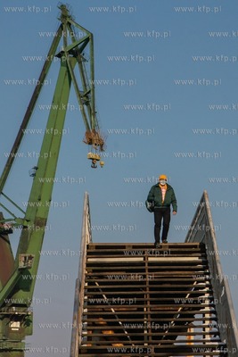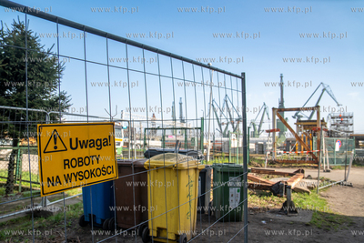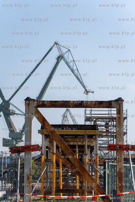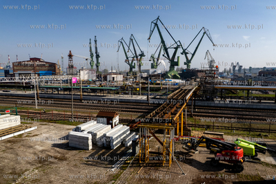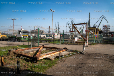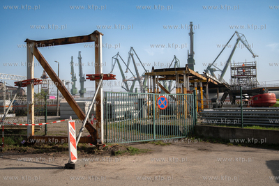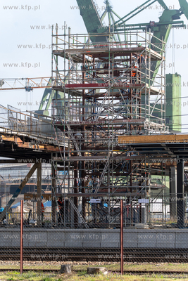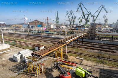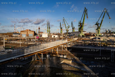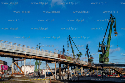 Kładka dla pieszych prowadzaca na przystanek SKM Gdańsk Stocznia. Konstrukcja ma zostać rozebrana w jej miejsce powstanie nowa. W tle żurawie stoczniowe. 15.12.2024 fot. Paweł Marcinko / KFP