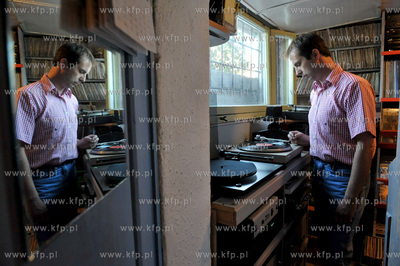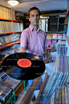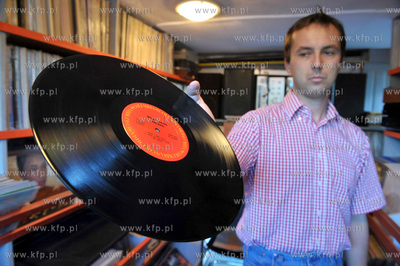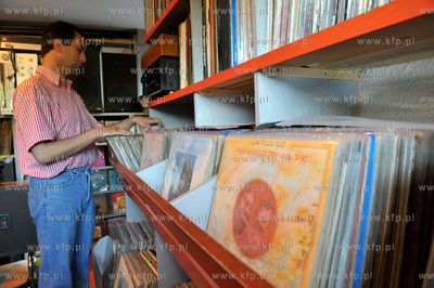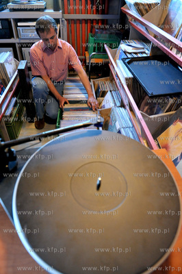 Sklep plytowy Muzyczna Piwnica na al. Rzeczypospolitej na gdanskim Przymorzu. Tutaj mozna kupic klasyczne czarne plyty analogowe oraz gramofony. Nz. sprzedawca i milosnik starej plyty Kamil Kulczyk.5.07.2011 Fot. Maciej Kosycarz / KFP