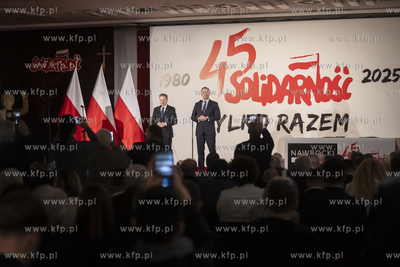 Historyczna SalaBHP Stoczni Gdańskiej. Komisja Krajowa NSZZ "Solidarność" oficjalnie poparła kandydaturę Karola Nawrockiego na urząd prezydenta RP. Nz. Karol Nawrocki.
