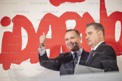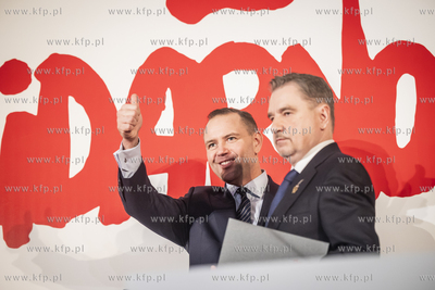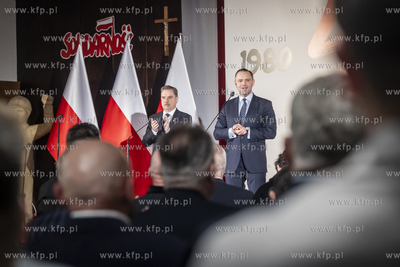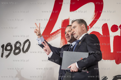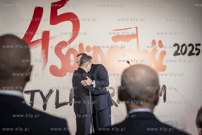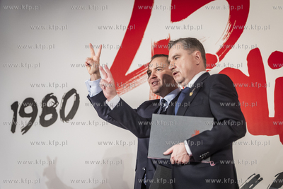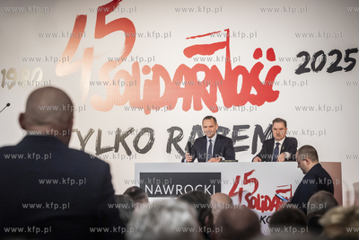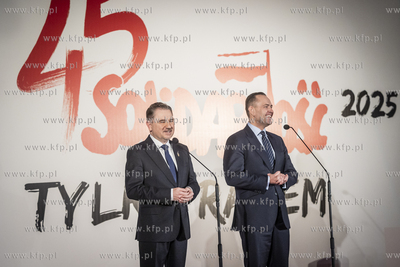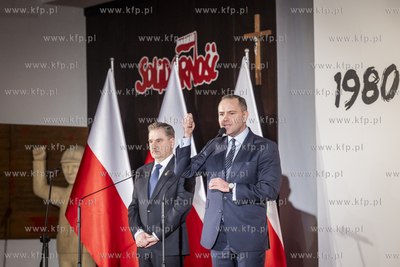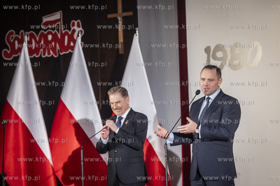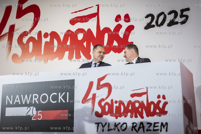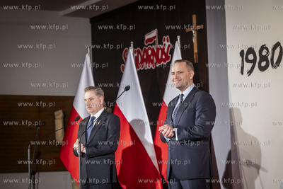 Historyczna SalaBHP Stoczni Gdańskiej. Komisja Krajowa NSZZ "Solidarność" oficjalnie poparła kandydaturę Karola Nawrockiego na urząd prezydenta RP. Nz. Piotr Duda, Karol Nawrocki.