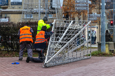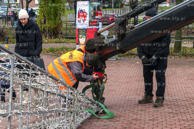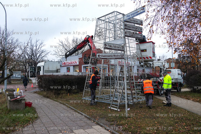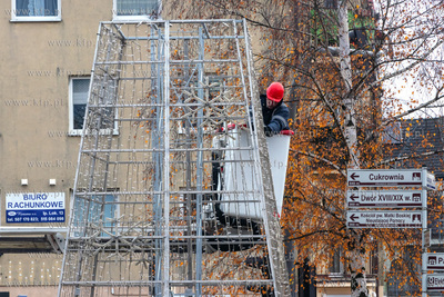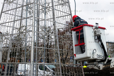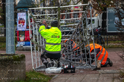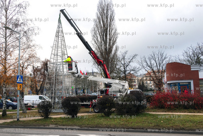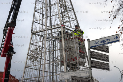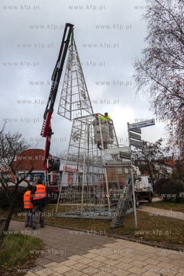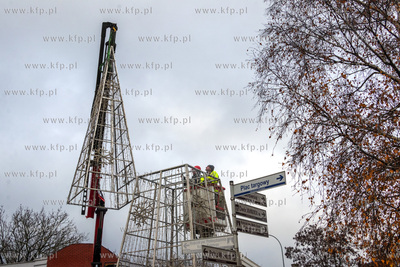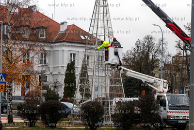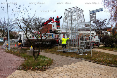 Montaż choinki przed budynkiem Urzędu Miasta w Pruszczu Gdańskim.