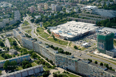 Gdansk Przymorze z lotu ptaka. Ul. Obroncow Wybrzeza i najdluzszy w Polsce budynek mieszkalny falowiec oraz Galeria Handlowa Przymorze z hipermarketem E. LECLERC. Widoczny tez pierwszy wiezowiec osiedla Cztery Oceany. 30.05.2011 Fot. Maciej Kosycarz / KFP