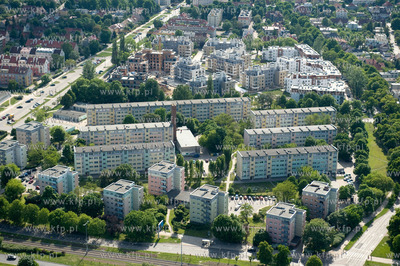 Gdansk Przymorze z lotu ptaka. W glebi Osiedle Oliwa Park zlokalizowane przy skrzyzowaniu ul. Poznanskiej i Boleslawa Krzywoustego. na dole ul. Chlopska, a po prawej ul. Piastowska. 30.05.2011 Fot. Maciej Kosycarz / KFP